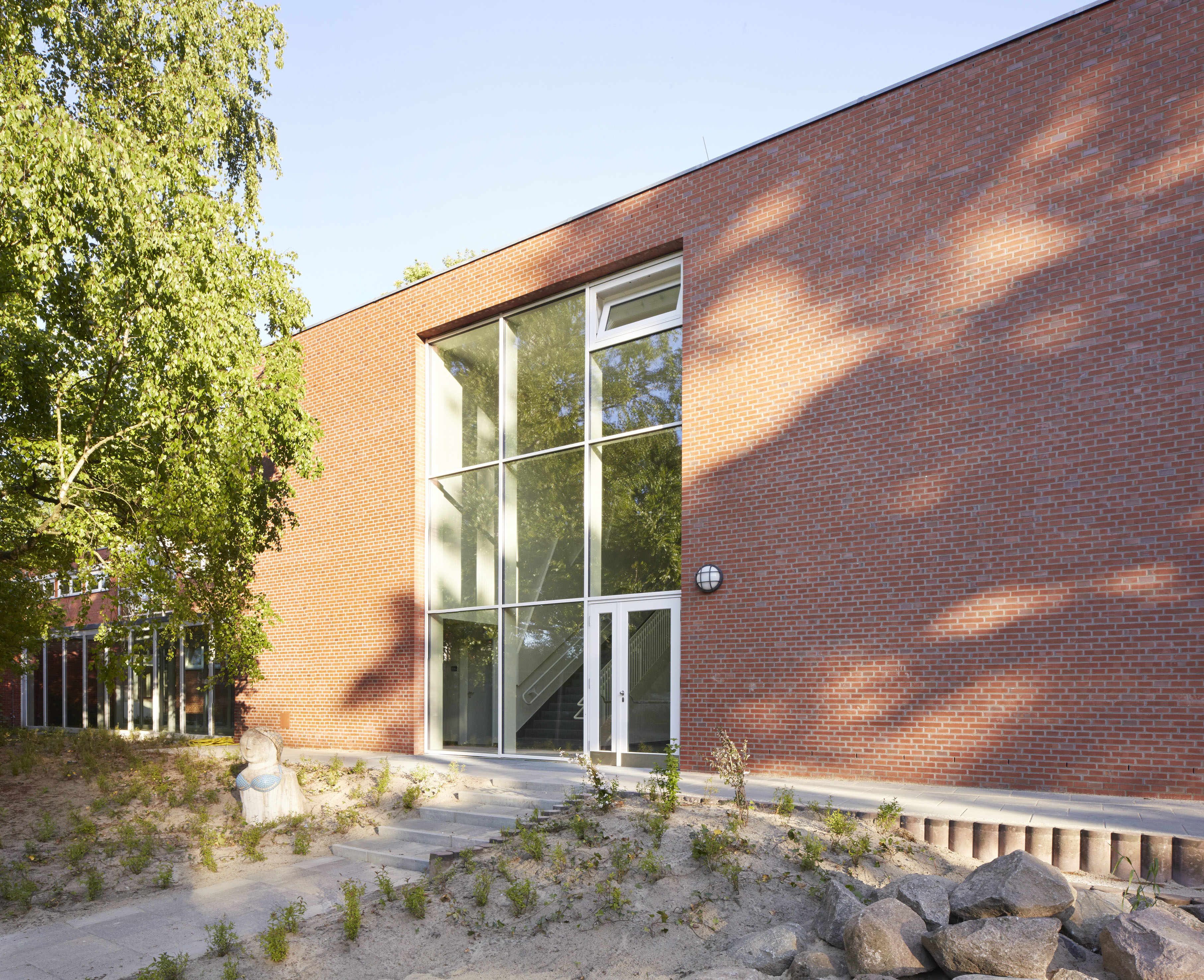 Die benötigte Baumasse wurde in einem einfachen, klaren und rechteckigen Baukörper (18 x 28 Meter) mit Flachdach untergebracht. Um den Bezug zum historischen Bestand zu wahren, greift die Fassadengestaltung mit einer Vormauerschale aus roten Klinkern sowie Holz-Glas-Elementen die prägenden Materialien der Bestandsgebäude auf. Im Inneren bildet eine zweigeschossige Halle mit einer großzügigen, einläufigen Treppe das kommunikative Herzstück. Im Erdgeschoss befinden sich sechs flexibel nutzbare Gruppenräume mit direktem Zugang nach draußen, die westseitig über Schiebetüren verbunden werden können. Das Obergeschoss bietet Platz für die Mensa, die Hortleitung sowie weitere Mehrzweckräume. Das Tragwerk des zweigeschossigen, rund 7 Meter hohen Neubaus haben wir als klassischen, robusten Massivbau in Stahlbetonbauweise konzipiert. Wände, Stützen und Decken sind in Stahlbeton ausgeführt, die Teilunterkellerung wurde als reiner Kriechkeller realisiert. Eine besondere ingenieurtechnische Komponente bildet der partielle Übergang zwischendem Neubau und dem bestehenden Schulgebäude. Während die Anbindung im Erdgeschoss über ein neues Flurgebäude erfolgt, haben wir den Anschluss im 1. Obergeschoss oberhalb des Haupteingangs als „Brücke“ ausgebildet. Hierbei kam eine leichte Stahlkonstruktion zum Einsatz. Diese filigrane Lösung ermöglichteine architektonisch elegante und statisch saubere Anbindung des massiven Stahlbeton-Neubaus an das bestehende Treppenhaus der Schule.